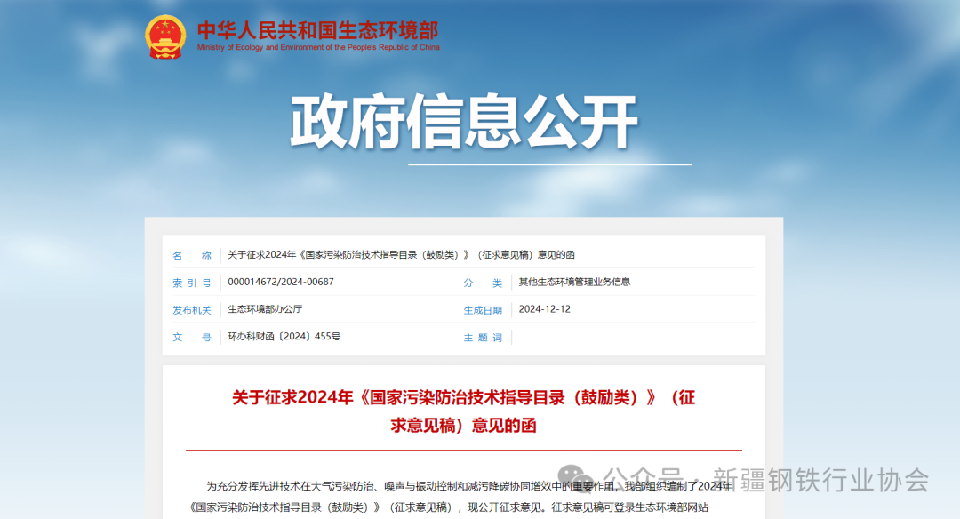 12月12日,生态环境部发布关于征求《国家污染防治技术指导目录(鼓励类)》(征求意见稿)意见的函。文件共提及19项技术,涉及钢铁、水泥、化工等行业。关于征求2024年《国家污染防治技术指导目录(鼓励类)》(征求意见稿)意见的函
